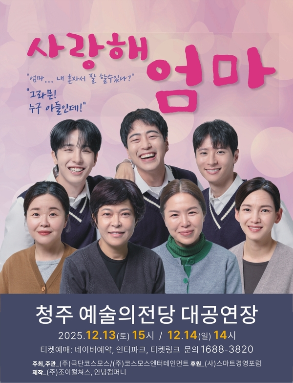 연극 ‘사랑해 엄마’ 청주공연은 오는 12월 13일 오후 3시, 14일은 오후 2시 청주예술의전당 대공연장에서 상연된다.