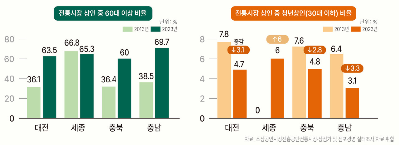이와 함께 충청권에서도 청년 상인의 비율은 2013년 대비 2~3%p 줄어든 것으로 나타났으며 2023년 기준 60대 이상 고령 상인의 비중은 4개 시·도 평균 64.6%로 전국 수준을 상회했다.