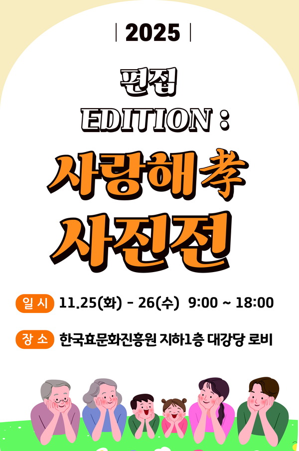 [충청투데이 김다영 기자] 한국효문화진흥원(이하 ‘한효진’)과 충청투데이가 공동으로 기획한 ‘2025 편집 EDITION: 사랑해 孝(효) 사진전’이 오는 25일부터 이틀간, 한효진 지하 1층 대강당 로비에서 개최된다.